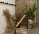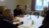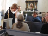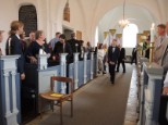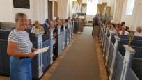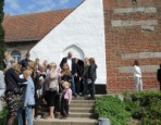 | Sommerudflugten fra Aarup Lokalhistorisk Arkiv og Forening gik i år til Kerte. Arkivet udgav i foråret bogen ”Mølleknappe”, og udflugtens mål var netop at se matriklen hvor enestegården engang lå, samt en rundvisning i Kerte Kirke. Kirken havde venligt stillet konfirmandstuen til rådighed for selskabet. Kirketjener Jørn Erik havde i dagens anledning pyntet op med lys og blomster i kirken. I konfirmandstuen havde han dækket bord, lavet kaffe og gjort det så vældig hyggeligt for gæsterne. |  |