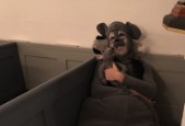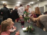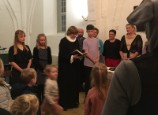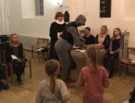 | Fredag d. 9. november 2018 var Kirkemusen tilbage i Kerte Kirke. Kirkemusen lå og sov da gæsterne kom i kirke, og børnene måtte vække musen før gudstjenesten med 3 x voksendåb kunne begynde. Kirkemusen underholdt børn og voksne med sin tavse mimik og musik og blandede sig i gudstjenesten, så det kunne være lidt svært for præsten at finde fodslag. Den syntes også, at dens musebamse skulle døbes. Men den havde allerede fået navn, så den gik ikke! Efter gudstjenesten stod pandekagerne og alt tilbehøret klar i konfirmandstuen: kødsovs og salat, og selvfølgelig også det søde: is og sirup med mere. |  |