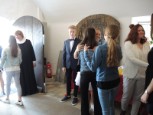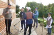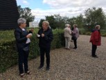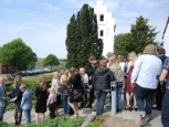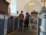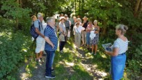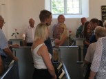 | Sommeren viste sig fra sin skønneste side, mens de ca. 30 deltagere tog turen ad den smukke markvej, Mølleknappe, som har navn efter gården, ned til engen hvor den engang lå. Mølleknappe brændte i 1947 og blev ikke genopbygget. Der fik de, foruden legenderne om Troldestenen i Brænde Å og de hellige munke på Torskebjerg, også bygningsbeskrivelse samt en nyere beretning fra avisen i 1935 om den forsvundne tjenestedreng fra Mølleknappe og de løbske heste. Selskabet gik derefter tilbage til kirken, hvor der var rundvisning. Kerte Kirke var gennem århundreder nært knyttet til folkene på Mølleknappe, og enkelte prominente beboere blev sågar begravet i selve kirken. Gæsterne hørte lidt om kirkens historie og inventar, stenkisterne med ægteparret Farenhorst fra Billeskov, epitafierne og om mindepladerne over Bille-familien og deres gravkammer, som blev “genfundet” under gulvet i koret i 1930, men først blev udgravet 30 år senere. Læs evt. mere Om kirken |